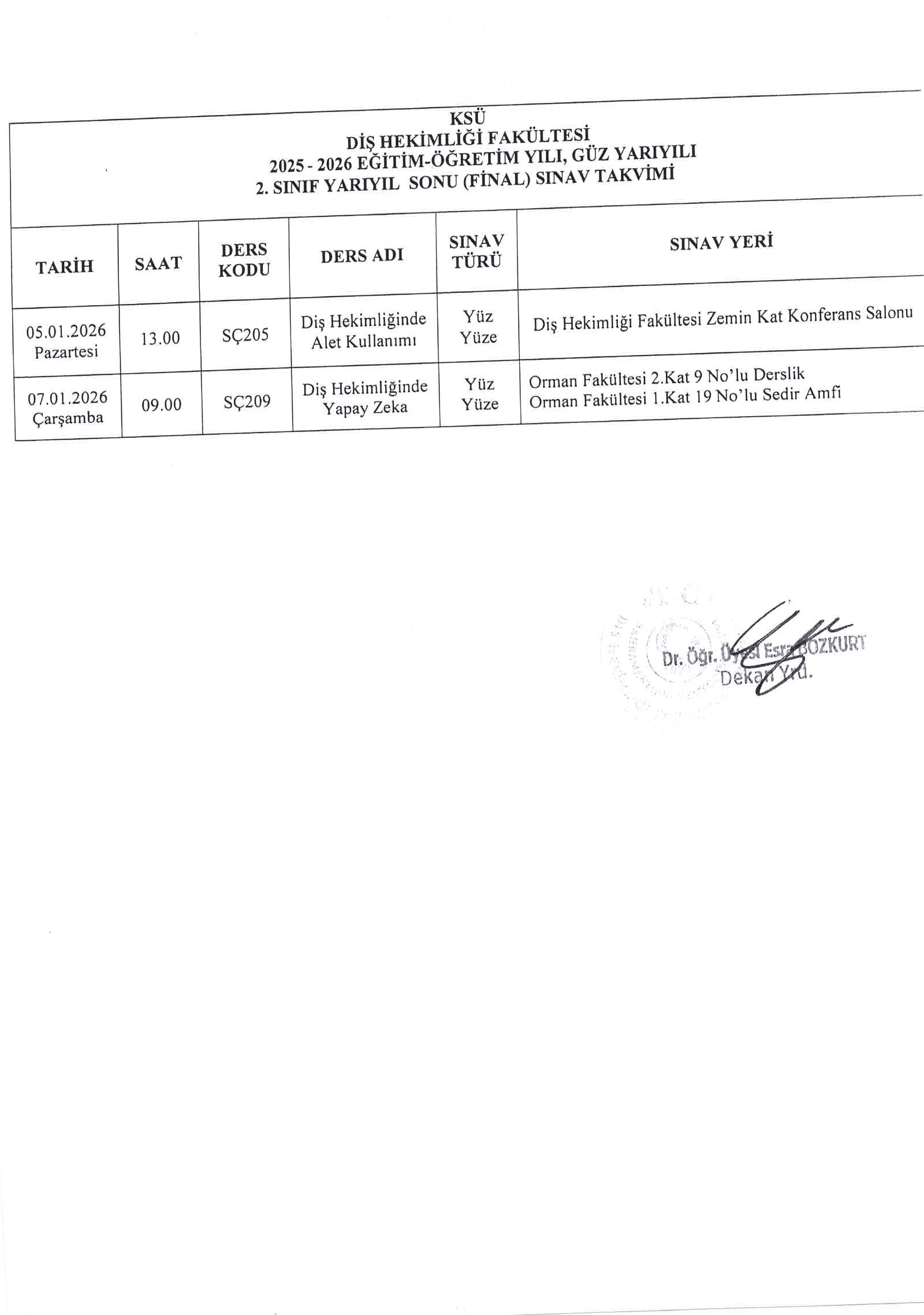 12.12.2025 - 2025-2026 Eğitim-Öğretim Yılı, Güz Yarıyılı 2. Sınıf Yarıyıl Sonu (Final) Sınav Takvimi