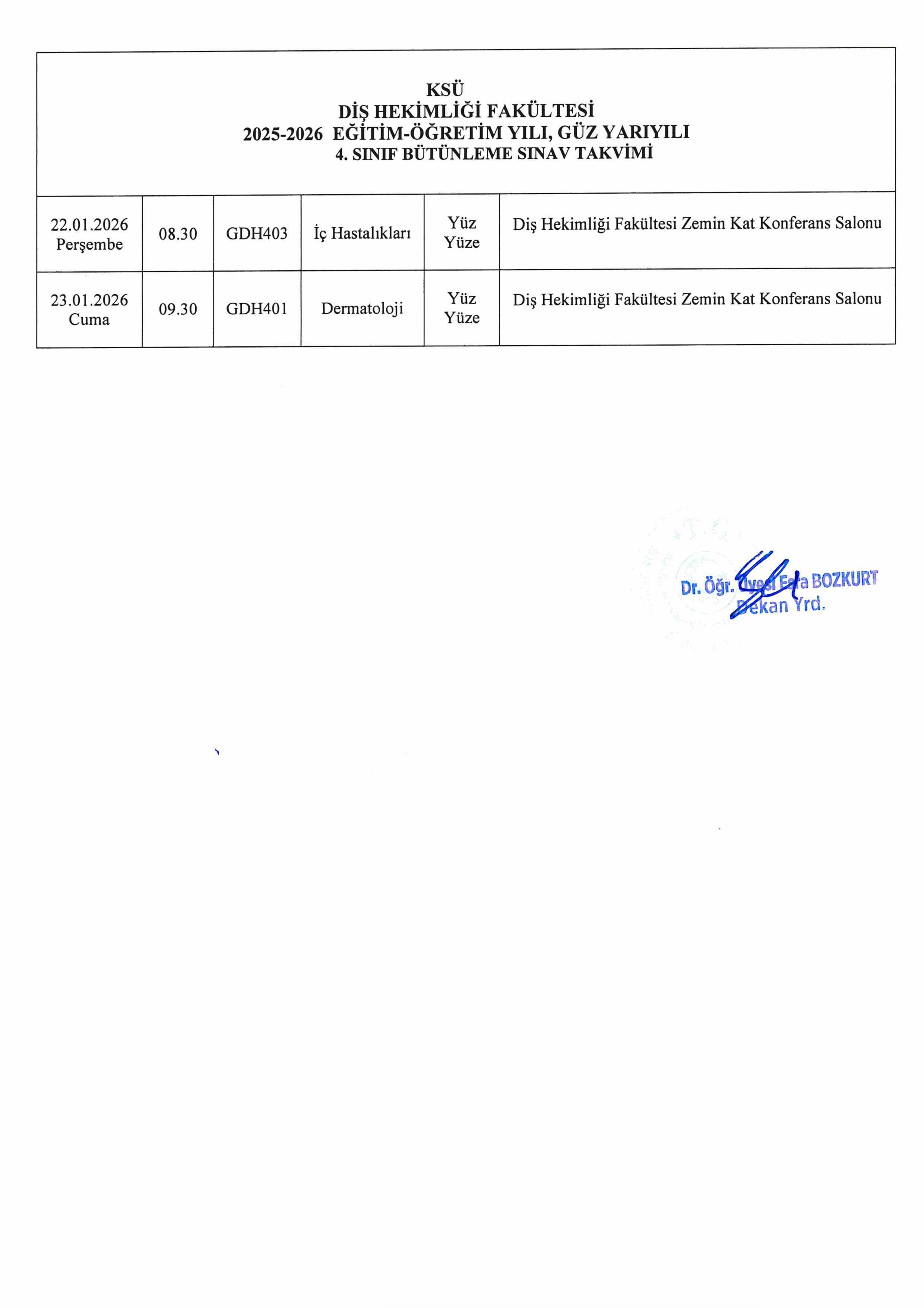 15.01.2026 - 2025-2026 Eğitim-Öğretim Yılı, Güz Yarıyılı 4. Sınıf Bütünleme Sınav Takvimi