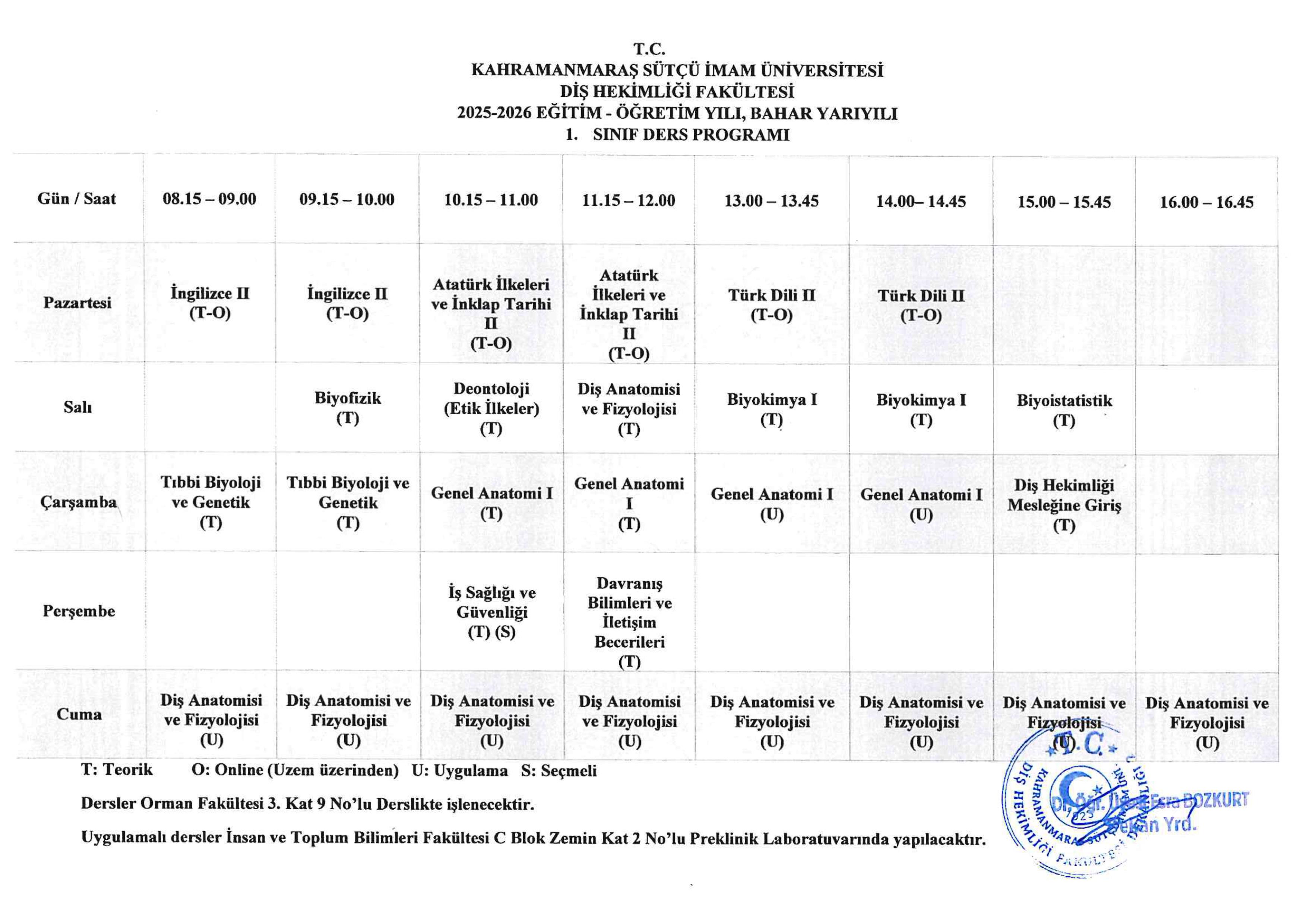29.01.2026 - 1. Sınıf Ders Programı (2025–2026 Eğitim-Öğretim Yılı, Bahar Yarıyılı)