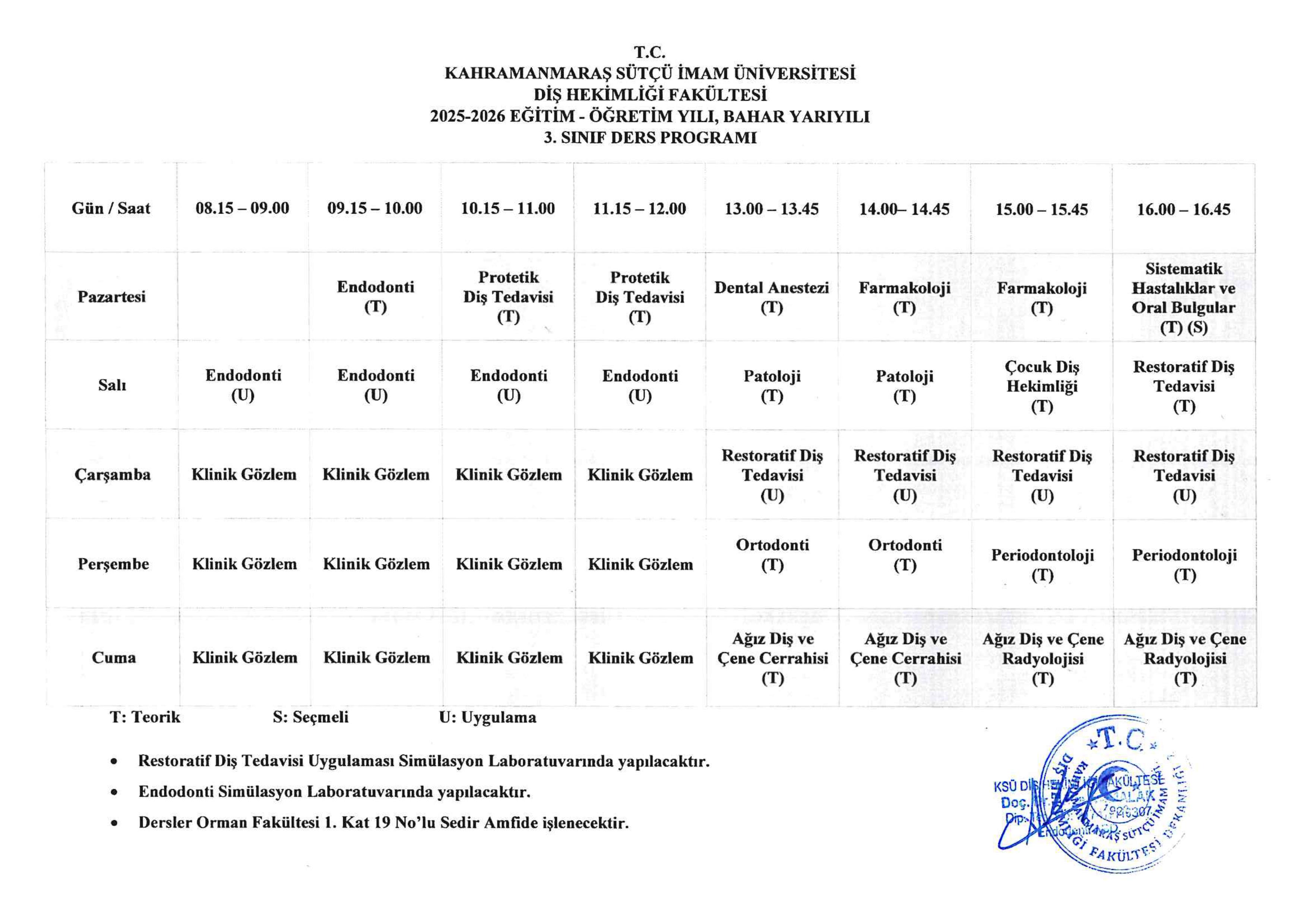29.01.2026 - 3. Sınıf Ders Programı (2025–2026 Eğitim-Öğretim Yılı, Bahar Yarıyılı)