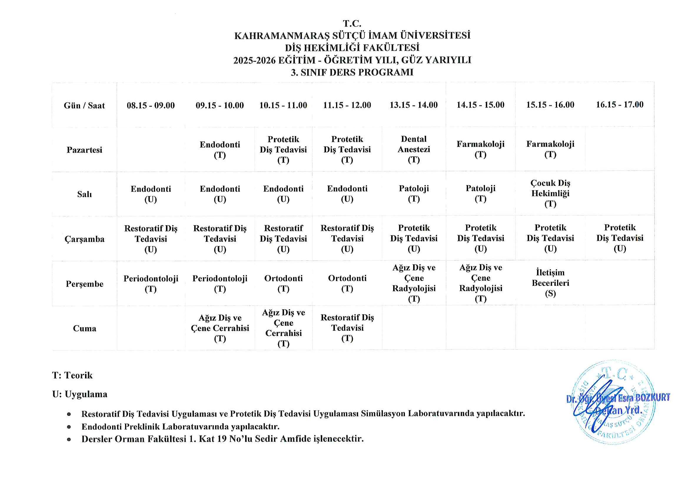 01.09.2025 - 3. Sınıf Ders Programı (2025–2026 Eğitim-Öğretim Yılı, Güz Yarıyılı)
